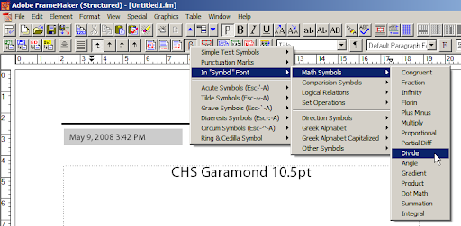 在Formatting栏,添加了Import File/Object/Format/Element Definition按钮,添加了Add cross reference/footnote/Variable等按钮,添加了一个菜单专门用来插入各种特殊符号(这个菜单如下图所示),添加了Object property按钮,添加了切换Body/Master/Reference Page视图的按钮,添加Apply Master pages按钮,添加Paragraph/Character Designer按钮,最后添加了文档中的Combined font, Color definitions, PDF Settings, View Options, General Preferences等对话框的启动按钮,以及切换文档锁定状态的按钮。
